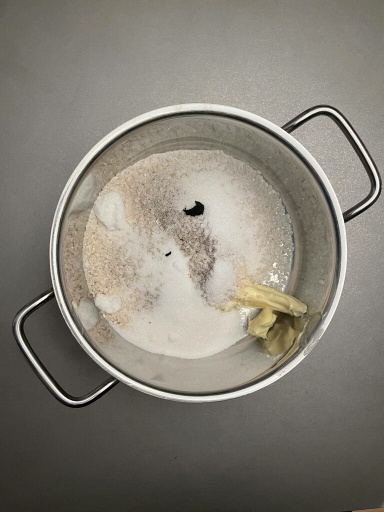 - In einem Topf Butter, Reis, Milch, Salz, Vanillezucker und die Vanille aus der Vanilleschote gemeinsam aufkochen – Achtung nicht zu heiß aufkochen – lieber auf kleiner Flamme für ca. 20-30 Minuten köcheln lassen. Achtet darauf, dass immer brav umgerührt wird, damit ja nix anbrennt.