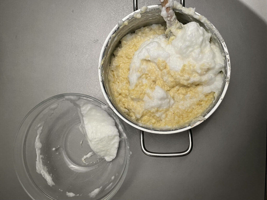 - Eigelb unter den Milchreis rühren und anschließend Eischnee vorsichtig unterheben.